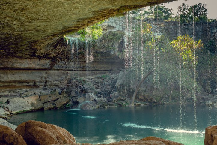 It’s not your typical waterfall, but the water is indeed flowing. Pedernales Falls is more of a flat formation where water runs sideways over sheets of million-year-old limestone, creating little pools. The Pedernales Falls State Park was once the bottom of the ocean, which explains why some of the limestone has been there for 300 million years and parts of the park look prehistoric. You’ll find this waterfall in Texas Hill Country’s Johnson City.