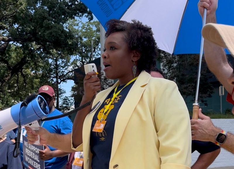 Sheria Smith, president of the American Federation of Government Employees Local 252, spoke to hundreds of educators outside Sen. Ted Cruz's office on June 20 in Dallas. (Photo by Katie Serrano)